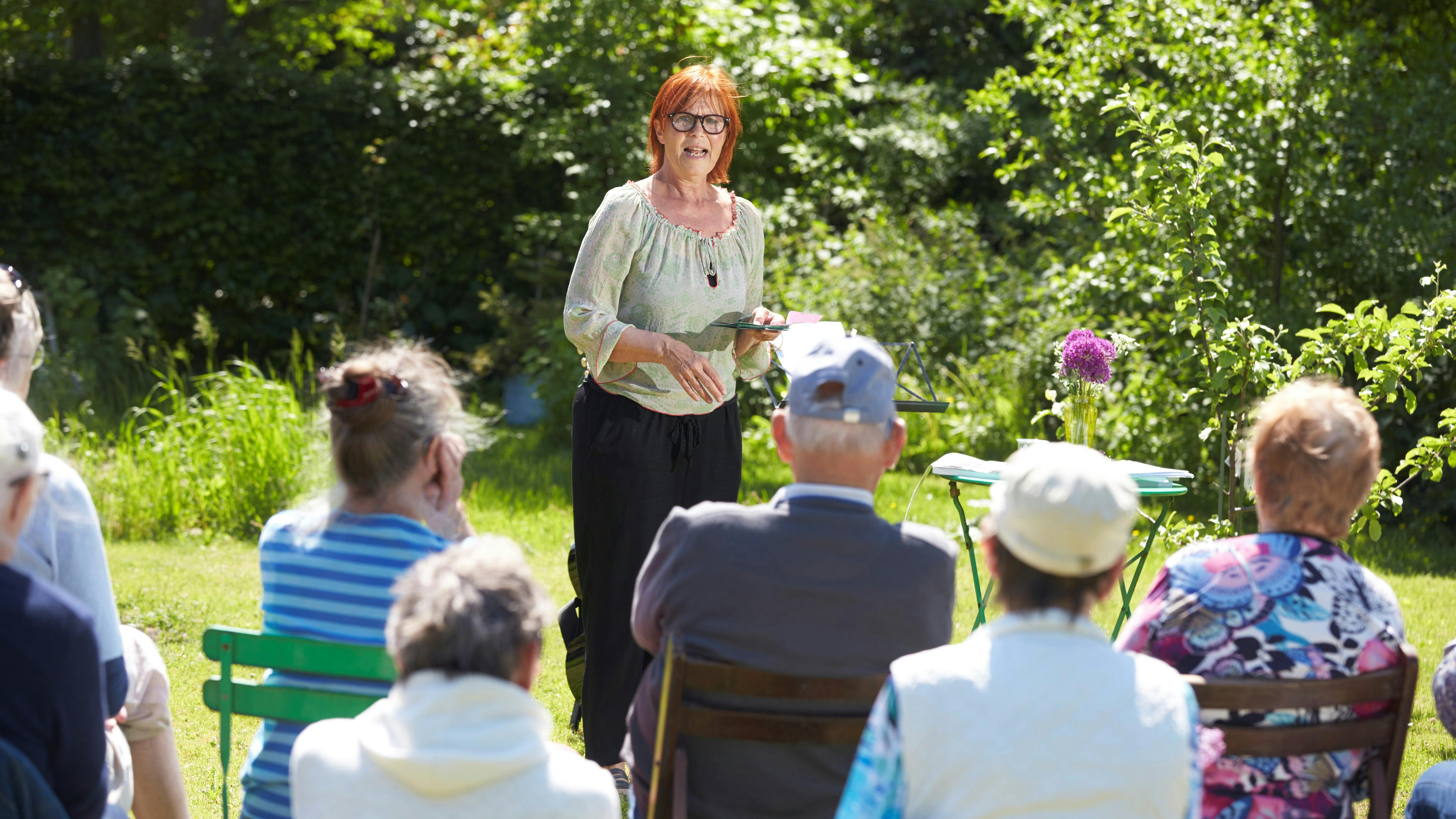 Men som et første spadestik står hun nu og fortæller havens gæster om et historisk øksefund ved Dybvig, om fejbattingen Løg-Ole på 93 år, der sidder smilende blandt publikum, og om øens egen valuta bestående af genbrugskvitteringer, der kaldes for røde rejer og blå bananer og nu kan købes som souvenir.