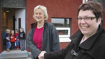 Det var lederen af Røde Kors Børnehaven i Mariager, Birgit Busk, som her (tv.) byder Anette velkommen, der fik børnehavelederne i Lærkebo, Spiren og Lærkereden med på idéen. Så nu overlader børnehaverne lønopgørelser, budgetplanlægning og indberetninger til deres delemedarbejder.
