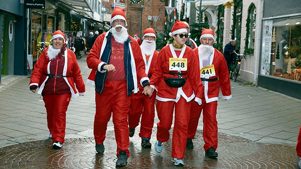 – Vi skal nok få os gået varme, siger Karsten og tager Erika i hånden. Sammen går de hen mod startlinjen, for nu skal det store julemandsløb til at begynde.