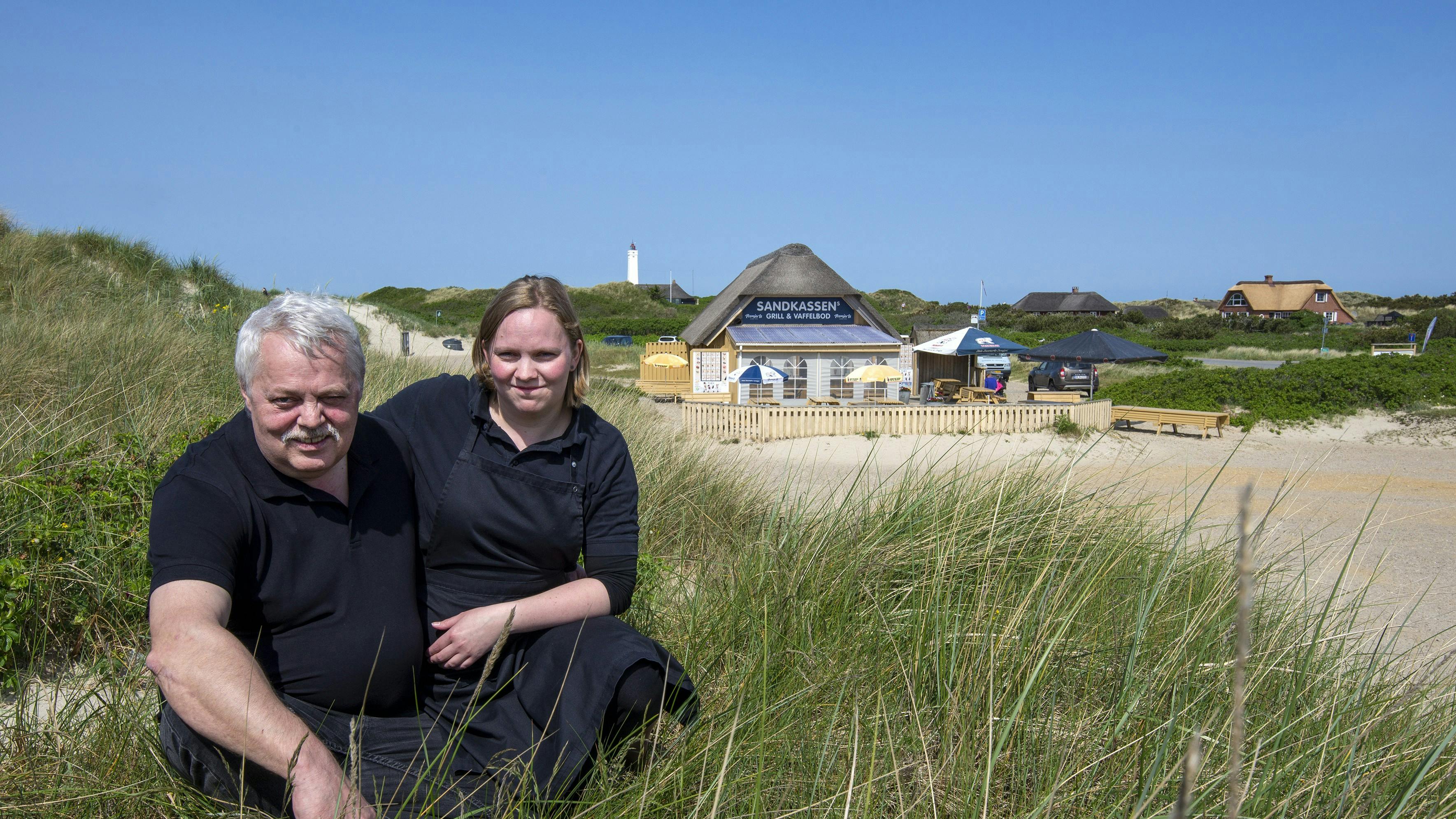 Vi er i Sandkassen. ’Sidste madsted før England’, som vaffel- og grillbaren reklamerer med. Klitterne næsten omkranser det stråtækte hus, og Vesterhavet bruser ind få meter væk.