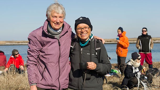 Det kan godt være, at det er lange gåture, der er på programmet, men faktisk er det fællesskabet blandt turens deltagere, der er i højsædet. Det fortæller turlederen, 66-årige Gunhild Madsen. Hun går netop ved siden af 81-årige Kirsten Svendsen, sin veninde, som hun kun ses med på vandreture. Men her lærer de så til gengæld hinanden vældig godt at kende.