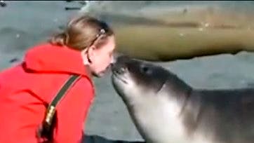 Men denne sæl i South Georgia Island har kastet sin kærlighed på en kvinde, der stille og roligt sidder i vandkanten for at nyde synet af dyrene.