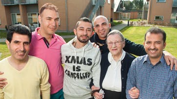 - Vi kalder Bente for vores farmor, siger Karim og smiler kærligt til sin nabokone på 93, da de alle er samlet en solbeskinnet forårsdag på terrassen til stærk syrisk te og kardemommekaffe.