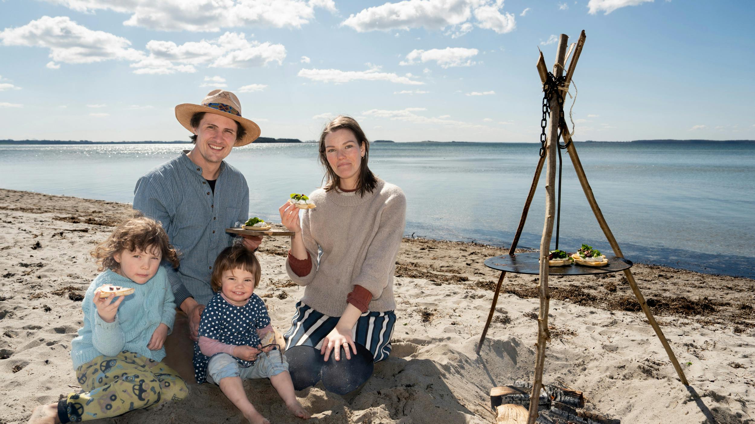 Lugten af bål spreder sig på stranden i Millinge, mens Frederik sidder på knæ i sandet og puster liv i gløderne. Familien Husted har sanket de urter, de skal bruge og er nu klar til at tilberede dagens frokost i det fri.