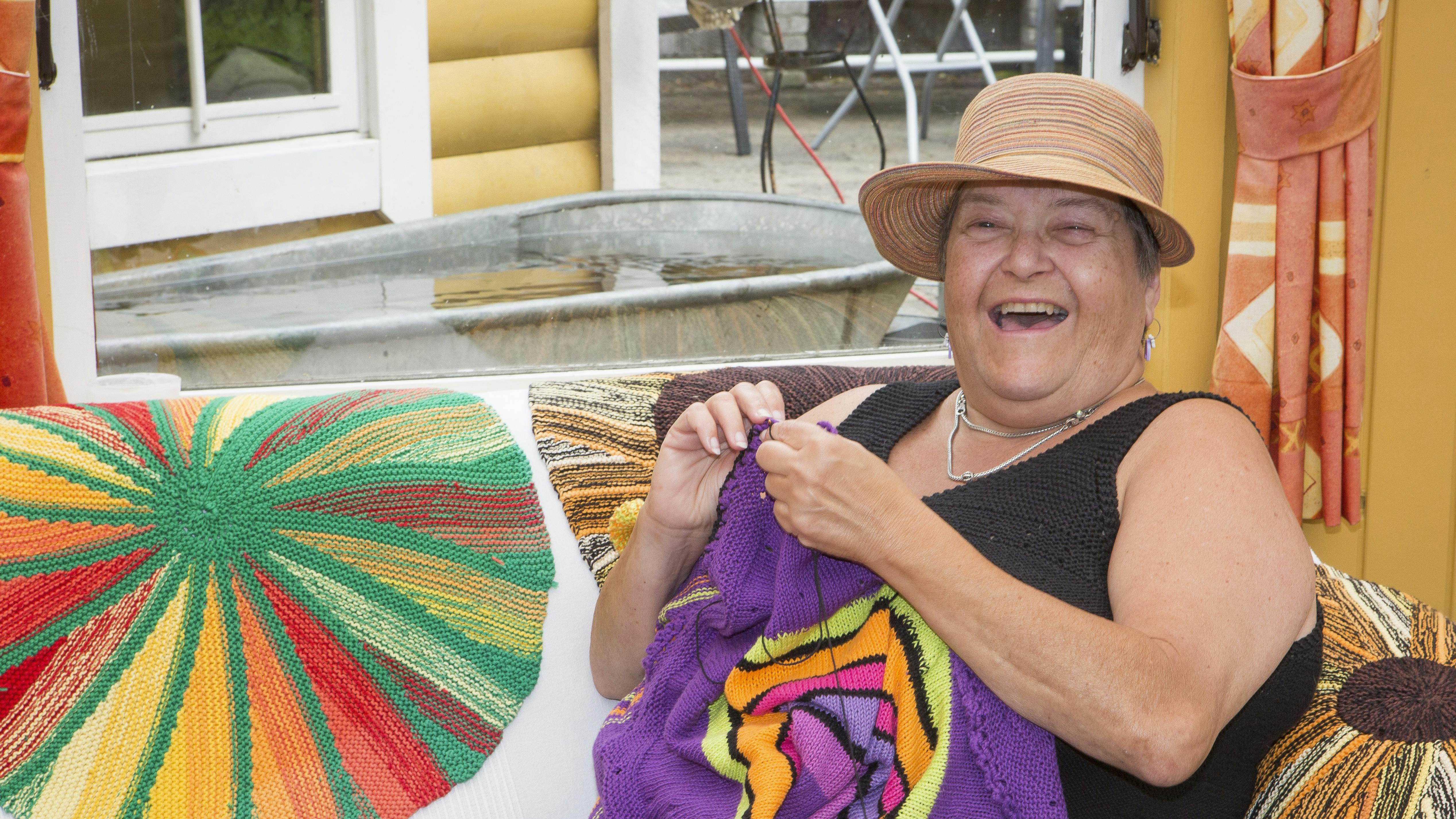 Vibeke strikker, hendes mor hæfter ender, og hendes mand, Daniel, maler husene og klistrer de strikkede blomster og sole på, og sådan har Vibeke sørget for, at hele familien har en fornuftig hobby.