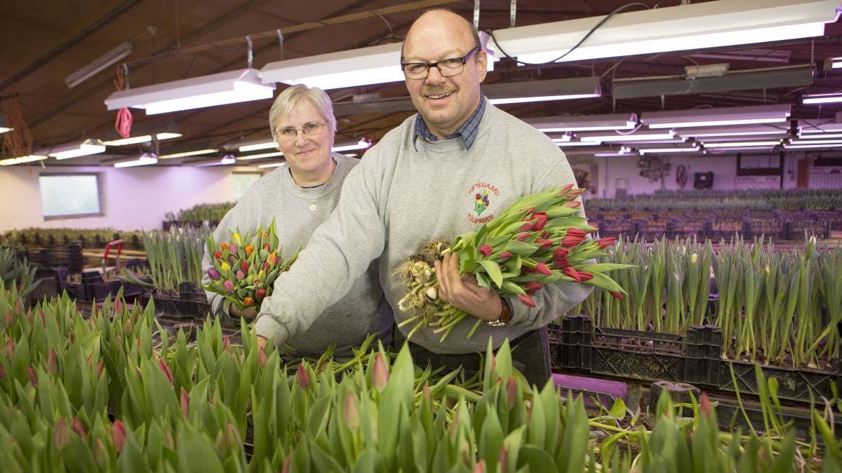 Jette kan ikke huske, at hun nogensinde har fået blomster af sin Bent, og han har da ellers haft 26 år til at huske den slags mærkedage som mors dag og fødselsdage. Men hvad skulle det også gøre godt for? Hun kan plukke favnen fuld af de sprødeste duftende tulipaner og tage dem med ind i huset, hvis det er det, hun vil. – Der er masser og masser af arbejde på en gård, men vi bestemmer selv, hvornår vi laver det, siger Jette og Bent. Eller måske er det årstiderne, der bestemmer? I hvert fald har Jette og Bent travlt nu. I morges var de på Grønttorvet klokken 6, så skulle de hjem til Toftegård igen, hjem og plukke tulipaner og gøre dem klar til salg. Læs også om Marias landmandsdrøm