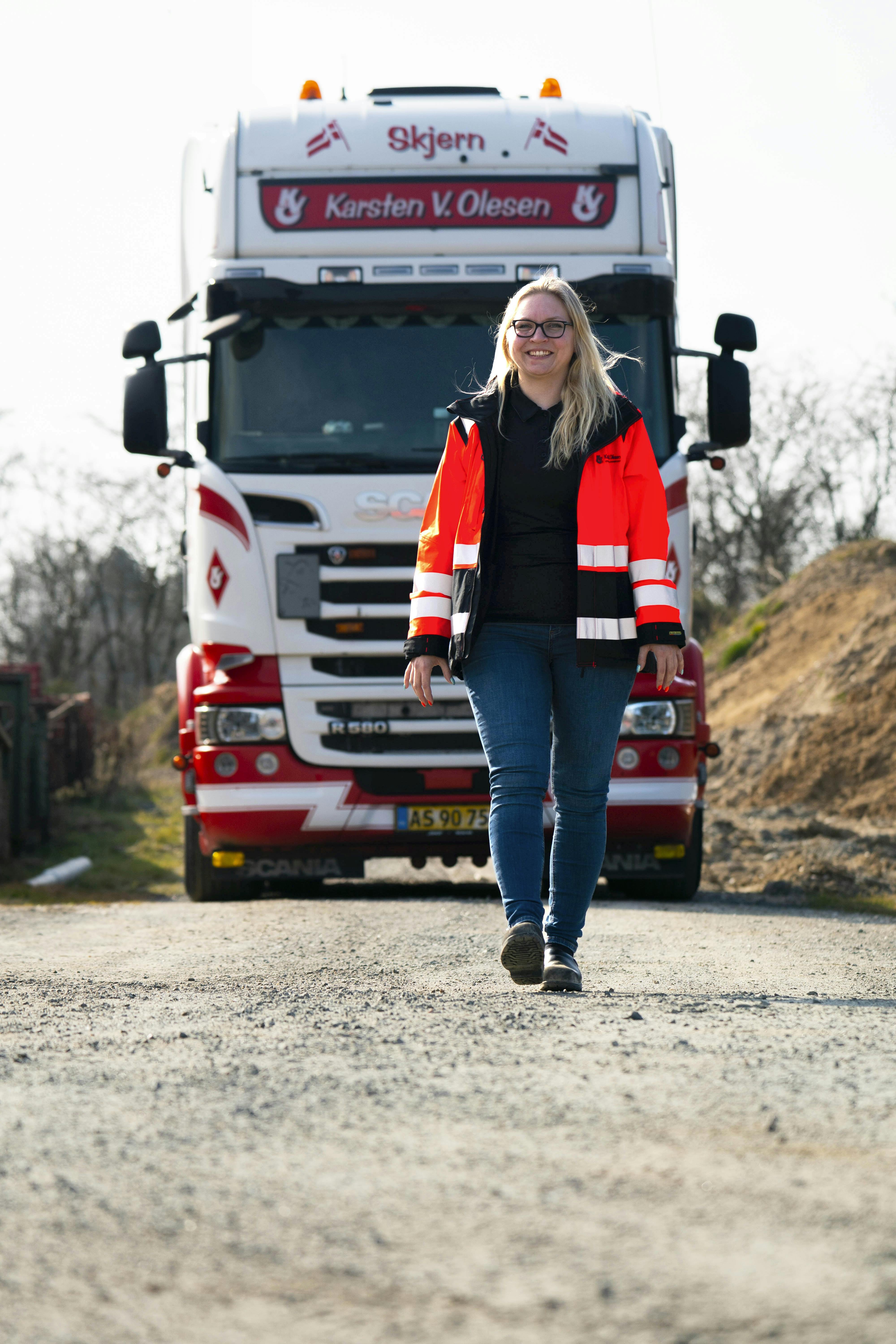 Hun er netop fyldt 30 år. Hun har været på landevejene i syv år nu, og hun har arbejdet i et par forskellige firmaer, kørt DAF, Volvo og nu Scania. Hun har kørt med alt fra blomster og paller til betonelementer, og hun har været de fleste steder i Danmark. Hun elsker stadig biler, og der er forskel på dem.