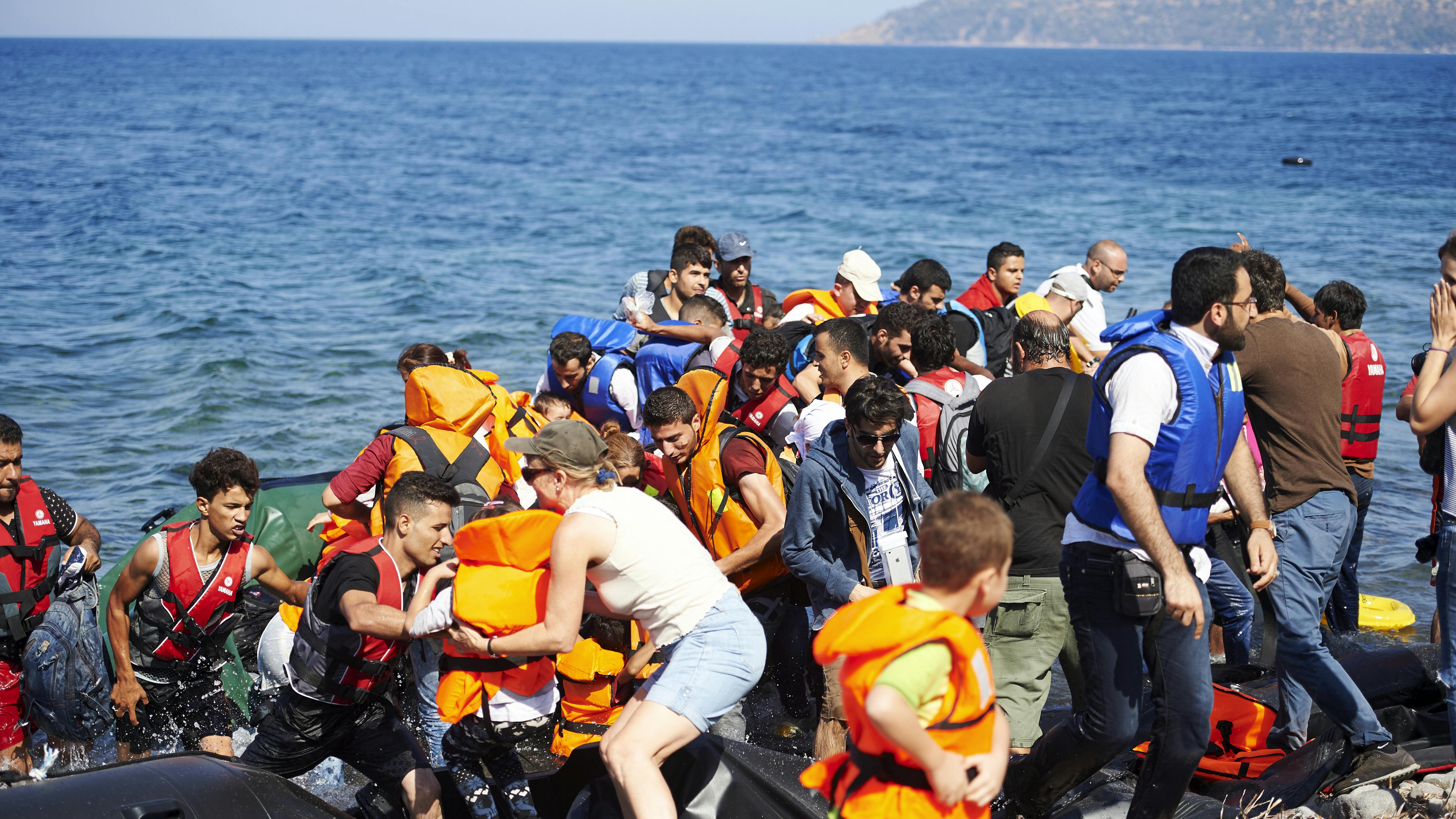 Mens gummibåden slår mod stenene, løftes små, våde, grædende børn ud over kanten, kvinder forsøger at få fodfæste på de glatte sten, mens de krampagtigt med den ene hånd holder fast i et barn og den anden i hanken på en rygsæk.