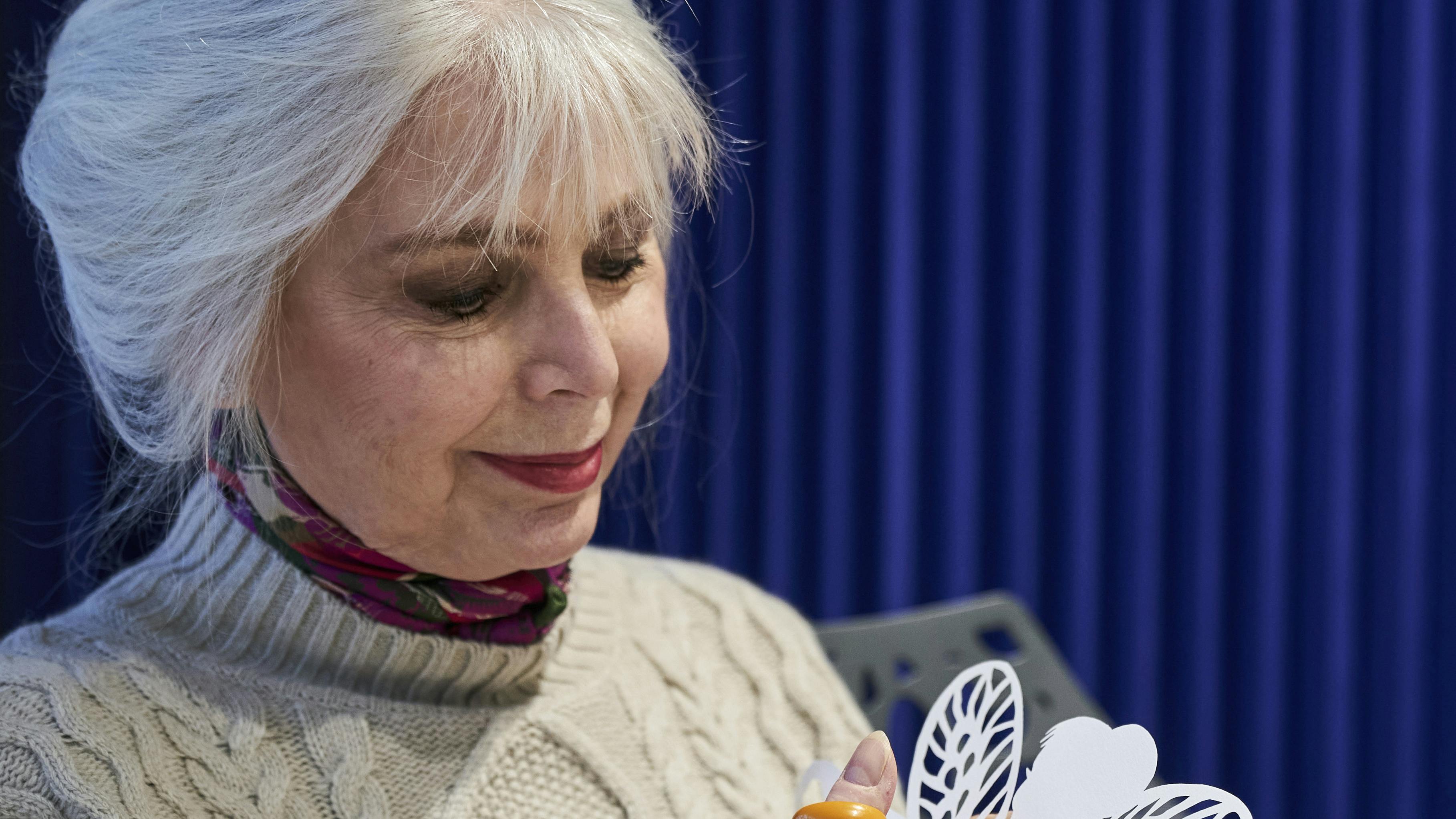 – Jeg så en mand, der sad og lavede papirklip i Tivoli – og det var slet ikke gækkebreve. Det var som at få en hel åbenbaring, for han klippede silhuetter af dyr og mennesker, historier og alt muligt forskelligt ud af papir. Jeg blev simpelt hen så glad, for det var jo det, jeg også ville. Da jeg kom hjem til Jylland igen, huggede jeg min mors broderesaks, som hun alligevel aldrig brugte, og så klippede jeg eventyr og historier, men jeg holdt dem stadig for mig selv. Det blev min afslapning eller meditation. Når jeg klippede, var jeg helt i ro med mig selv.