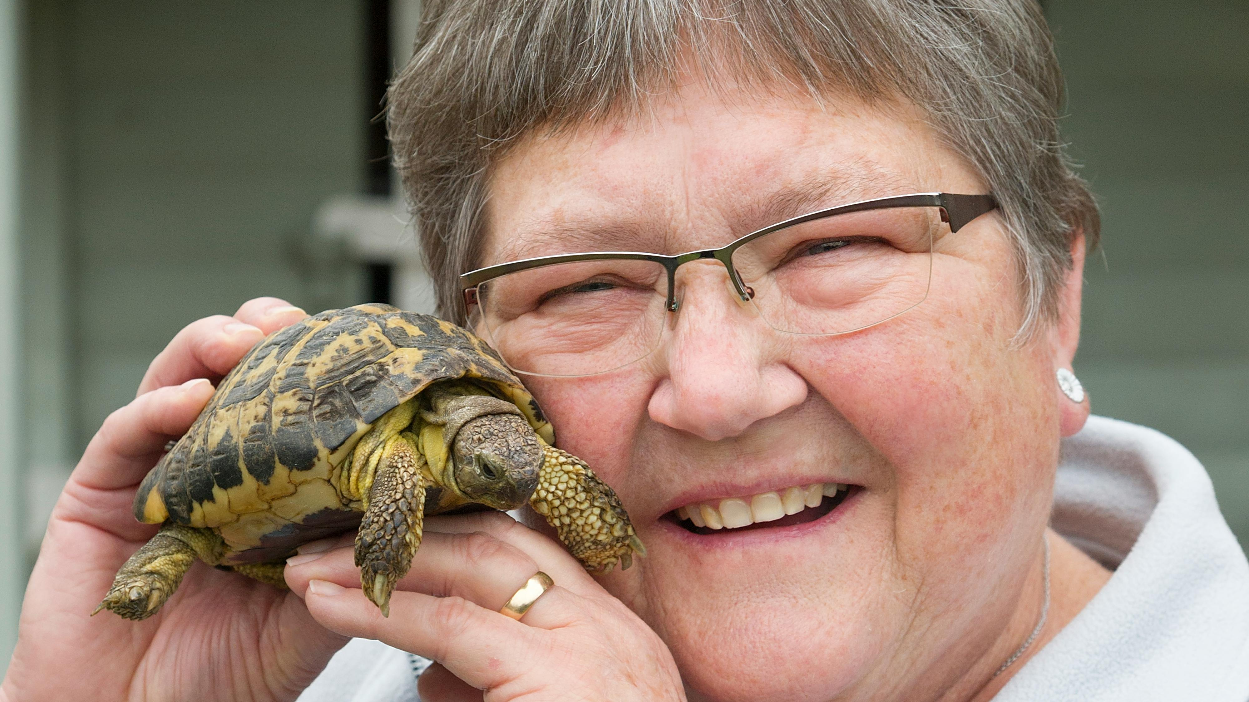 – Han er en kælepotte, og det skulle man ikke tro om en skildpadde, vel? Hver morgen, når han vågner, kommer han i bad i en dyb tallerken med håndvarmt vand i, og når jeg vasker ham på skjoldet med den bløde del af en grydesvamp, sætter han sig af og til op på bagbenene. Jeg smører også tit hans fine skjold med madolie, det har det godt af, og han kan rigtig godt lide det, fortæller Ulla.
