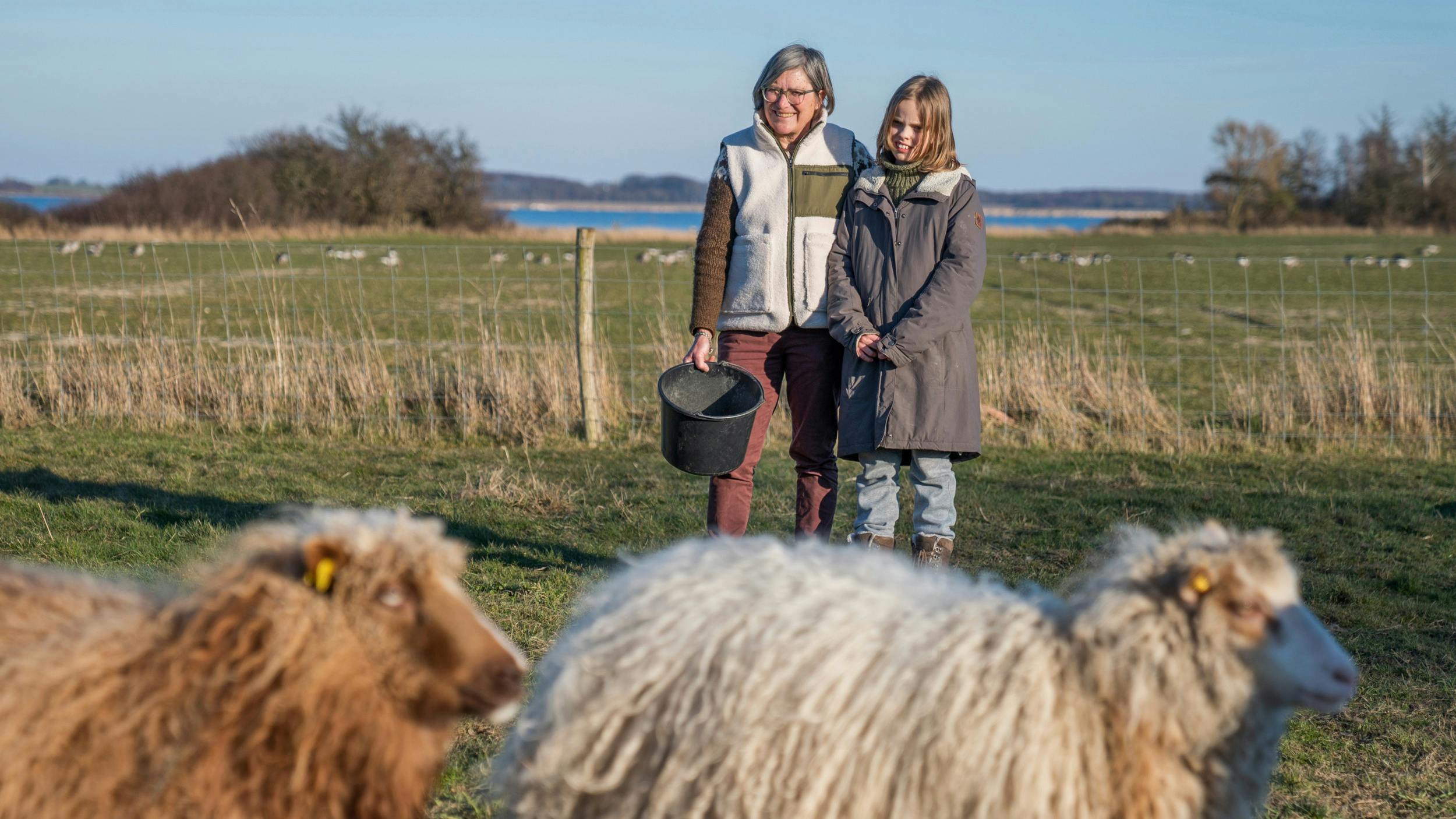 Den ene er 10 år. Den anden 67. De står hver sit sted i livet. Merete er enke. Hendes mand var præst, og de nåede at købe huset her midt i naturen, inden han døde. Her bor hun nu, ved kanten af Guldborgsund, ikke alene, men sammen med fårene, hunden og kattene.