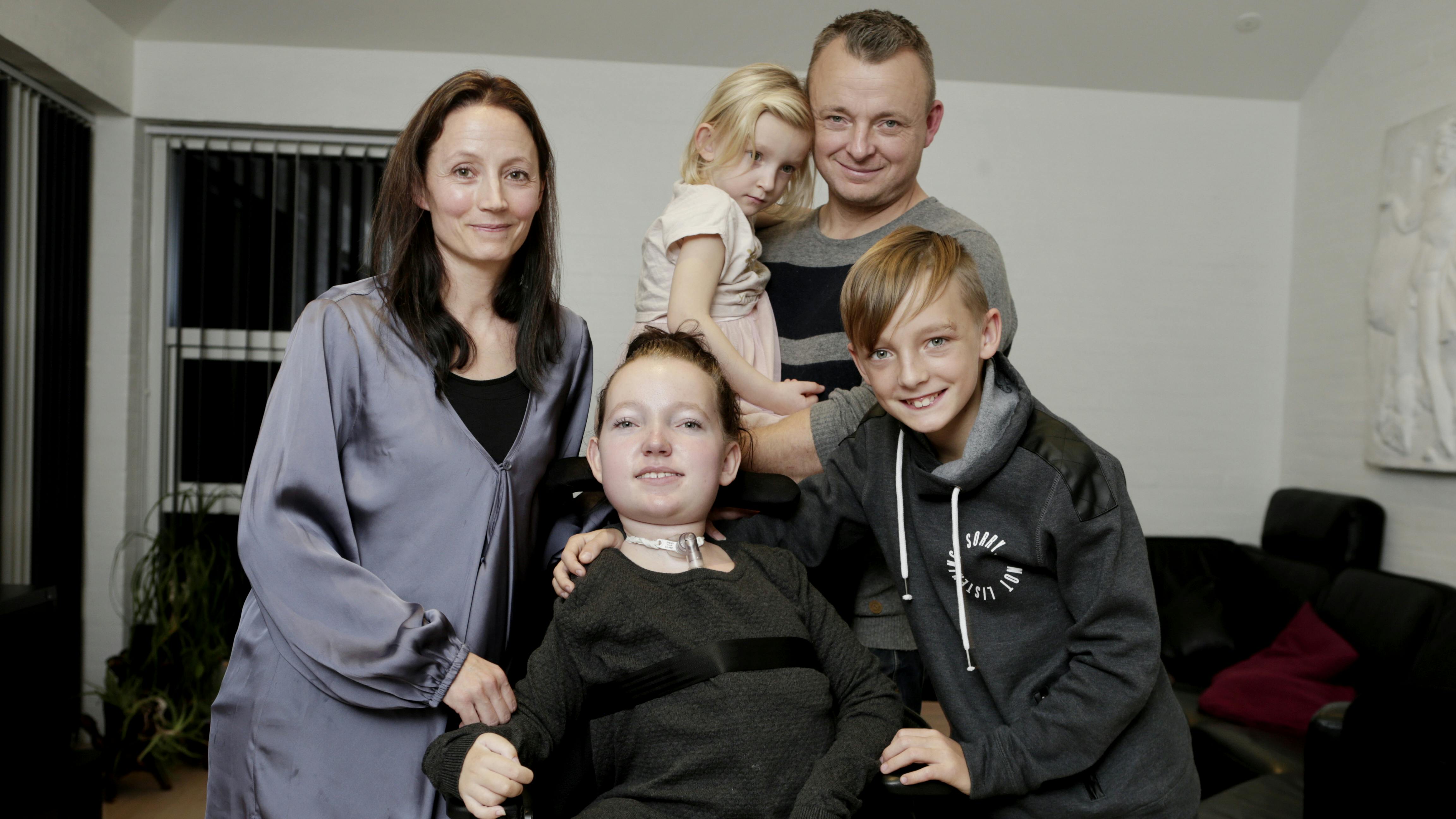 Mille skulle til at have en holdning som en flot, ung dame i stedet for en skæv banan, griner Charlotte. Hun taler om rygoperationen, som hendes datter var igennem i september sidste år. Mille er nemlig født med muskelsvind, nærmere betegnet spinal muskelatrofi type to. Den dom fik familien, lige inden Mille fyldte 1 år. Sygdommen sidder i rygmarven, hvor nervecellerne ikke fungerer. De celler, som skal signalere til musklerne, at de skal trække sig sammen, forsvinder. Derfor svinder musklerne ind. Og derfor har Mille muskler som et barn på ni måneder.