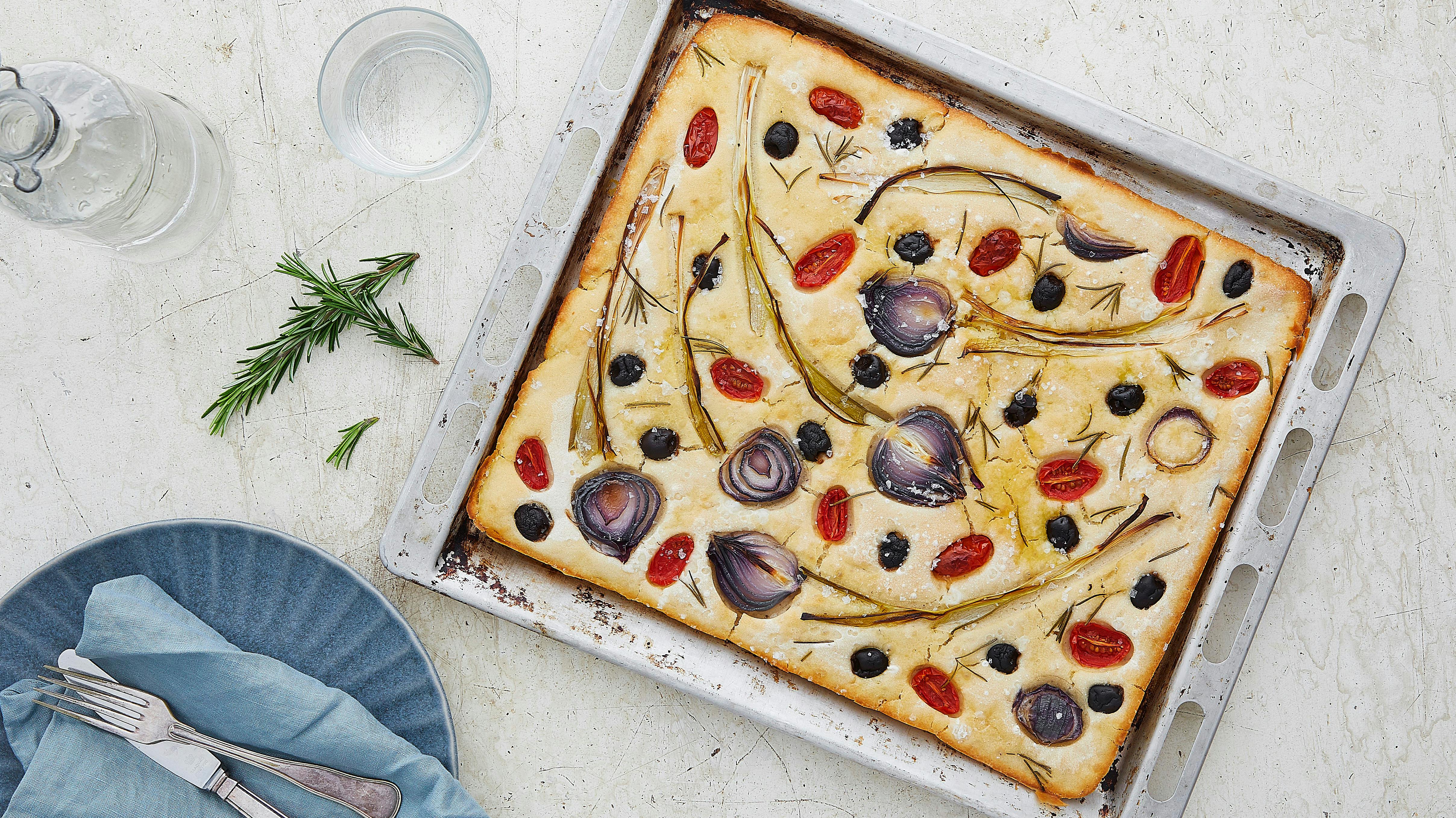 Pynt: Pil rødløg, og skær det i tynde skiver, der stadig hænger sammen i bund og top. Halvér tomater og forårsløg på langs. Pynt den færdighævede dej med de 2 slags løg, tomater, oliven og rosmarin. Dryp olivenolie over, og drys brødet med salt. Smid ½ dl vand ind i bunden af ovnen, imens du sætter bradepanden ind, og bag brødet i ca. 25 minutter, til det er gyldent og gennembagt.