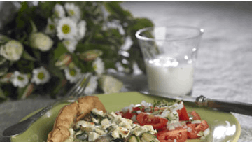 20 min. + 20 min. i ovnen(3 pers.)1 pk. færdig tærtedej300 g courgetter100 g champignoner1 løg1 spsk. olie2 fed finthakket hvidløg1 bdt. hakket