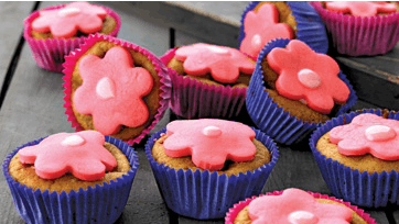 Hæld dejen i 15 muffinsforme og bag kagerne ved 200° i 25 min. Bland halvdelen af æggehviden med 225 g flormelis og et par dråber rød farve og ælt sukkermassen godt sammen. Rul sukkermassen ud i 2 mm tykkelse og skær blomster ud med en udstikker.
