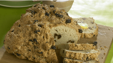 Tænd for ovnen på 225° varmluft. Sigt mel i en skål med natron og sukker. Vend rosiner i. Rør æg med mælk, pisk det i dejen og form et rundt brød, der lægges på bagepapir på plade og i forvamet ovn i 15 min., skru ned og bag færdig ved 200° i 20-30 min. Smager bedst når det er helt nybagt.