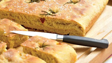 Rør gæren ud i vandet og tilsæt sukker, majsmel, salt og hakkede, soltørrede tomater. Rør melet i, ælt dejen smidig og rul den ud i 25 x 35 cm. Beklæd en bradepande i samme størrelse med bagepapir og pensl med olie. Læg dejen i bradepanden og lad den hæve under et klæde i 1½ time. Pensl med olie, drys med havsalt og rosmarin og bag foccaciaen ved 200° i 25 min. Tag bradepanden ud, vend foccaciaen, drys med havsalt og bag den i yderligere 10 min.
