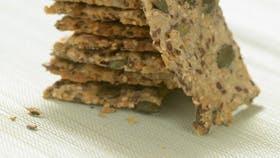Hak græskarkernerne groft med en kniv. Bland frø, mel, bagepulver og salt. Tilsæt olie og vand og saml dejen, den er meget blød. Del dejen i 2 portioner og rul en portion ad gangen ud mellem 2 stykker bagepapir. Fjern det øverste stykke bagepapir og skær dejen i firkanter. Læg bagepapir med kiksene over på en bageplade. Bages ved 200° på midterrillen 12-15 min. afhængig af dejens tykkelse. Læg kiksene på en rist og køl dem af.