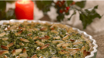 Knug vandet af grønkålen og bland den med de øvrige ingredienser. Hæld fyldet i tærtebunden og drys pinjekernerne på. Bag den færdig midt i ovnen ved 200° ca. 20 min.