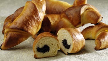 Smør birkesfyldet på og tril trekanterne sammen fra den brede side mod spidsen. Læg dem på plade med bagepapir og spidsen nedad. Lad hornene efterhævne påpladen i ½ time. Pensl med æg og bag dem 16-18 min. ved 200° på ovnens midterrille.
