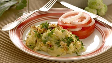 Bag kartoflerne møre i ovnen ved 200° på ca. 1 time og pil dem. Kog rosenkålen 5 min. i letsaltet vand, hæld den i en sigte og skyl den koldt. Skær rosenkålen i skiver. Mos kartoflerne, gerne med en gammeldags kartoffelmoser, rør dem med smør og æg og smag til med salt, peber og rigelig muskat. Læg et lag kartoffelpuré i en smurt tærteform, herover rosenkålen, som dækkes med resten af kartoffelmosen. Hak nødderne og bland dem med osten. Læg det oven på puréen. Sæt fadet i ovnen på midterrillen ca. 15 min. ved 225°, til osten er smeltet, nødderne er gyldne og kartoflerne er gennemvarme.