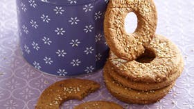 Rør gæren ud i vandet, tilsæt halvdelen af rugmelet og lad blandingen stå lunt og tildækket i 30 min. Smelt smørret og rør det i sammen med mælken. Rør resten af rugmelet i sammen med lakridssirup, sesamfrø og lakridspulver, ælt dejen sammen med hvedemelet og stil det til hævning i 30 min. Rul dejen ud i 2 mm's tykkelse og skær den ud i ca. 10 cm store cirkler med et 3 cm stort hul i midten. Drys knækbrødene med sesamfrø, bag dem ved 220° i 20 min. og lad dem afkøle på en bagerist. Lidt lækkert til madpakken eller måske et stykke ost.