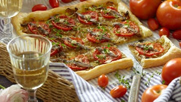 Rul butterdejen ud til 20 x 30 cm. Læg den i en bradepande med bagepapir. Smør løgringene ud over butterdejen. Skær tomaterne i tynde skiver og læg dem på løgmassen. Fordel ansjoser og hvidløgsskiver over og drys med timianblade.