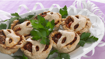 Saml dejen i en foodprocessor og læg den koldt. Steg løg, hvidløg og gulerod i olie og tilsæt kødet. Når det er brunet, kommes tomaterne ved, og det hele småkoger i 20 min., til væden er dampet ind. Smages til med krydderier. Kom dejen i linse-/muffinforme. Form dejen, som var det til små tærter, og kom fyldet i. Af den tiloversblevne dej skæres masker, der lægges over. Bages ved 200° i 20 min. Kan spises både kolde og lune.