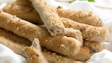 Skrab dejen ud på et melet bord og skær den i 10 stykker, der trilles i længder. Vrid dem med melede hænder til små baguetter, ca. 20 cm lange. Læg brødene på plade med bagepapir og lad dem hæve i 30 min. Sæt en plade i bunden af ovnen og varm den op til 250°. Pensl brødene med vand og tryk forsigtigt resten af nødderne ned. Sæt pladen i midten af ovnen. Hæld en kop vand på pladen i bunden af ovnen. Luk ovndøren og bag baguetterne ca. 15 min, til de er gyldenbrune. Lad dem køle af på en bagerist og spis dem lune.