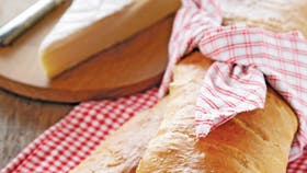 Smelt smørret og kom vandet i. Rør gæren ud i vandet. Tilsæt salt og ælt melet i lidt ad gangen, til dejen er let og ikke klistre. Lad dejen hæve tildækket et lunt sted i ca. 45 min. Rul dejen ud til en plade på ca. 25 x 35 cm. Rul den fast sammen fra langsiden. Tril den til en 60 cm lang og ca. 5 cm tyk pølse, del den i to og læg dem på en papirbeklædt bageplade. Pensel flutene med en blanding af vand og æggehvide og lad dem efterhæve ca. 10 min. Skær skråsnit med 6-7 cm mellemrum og lad dem hæve videre uden klæde. Pensel en gang til, mens de hæver. Pensel igen, når de er hævet til dobbelt størrelse. Bag dem ved 200° i