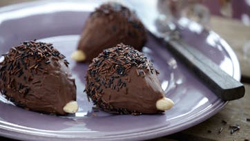 Rør kagesmuld med kakao, æblemos og romessens til en bastant masse. Del massen i 16 kugler og tril dem let kegleformet. Smelt chokoladen over vandbad, pensl den runde del af pindsvinene og drys med sukkerkrymmel. Sæt en mandel som snude og sukkerkugler som øjne.