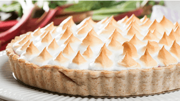 Pisk hviderne med sukker, maizena og sødemiddel til det er helt stift. Kom rabarberkompotten i tærtebunden og kom marengsen oven på. Bag tærten på 200 grader i ca. 20 minutter til den er gylden.