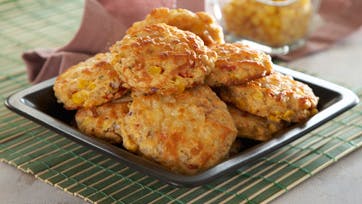 Bland peberfrugt, rødløg, majs, purløg, 2/3 af osten, krydderier, bagepulver og mel, tilsæt mælk og olie og rør hurtigt dejen sammen. Rul dejen ud i 1 cm tykkelse på et meldrysset bord og stik dejen ud i 7 cm cirkler med en udstikker. Pensl cirklerne med sammenpisket æg, drys med ost og bag dem ved 200° i 15 min.