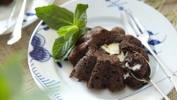 Smelt smør, chokolade og rom over vandbad. Afkøl helt. Pisk æg og æggeblommer med sukker til en luftig masse (ca. 8 min.). Fold den helt afkølede chokolademasse i. Sigt melet over og fold det forsigtigt ind i massen. Smør 4 ovnfaste, gerne slip let-, portionsskåle grundigt og fyld dem halvt op. Læg en blok hvid chokolade i midten. Fyld op med dej. Bag dem ved 180° i 12 min. Tag dem ud og lad dem afkøle et par min., inden de vendes ud. Serveres straks med lidt friske bær og evt. vaniljeis