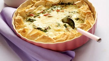 Løg hakkes fint, og champignoner skæres i skiver. Løg og champignoner ristes på en slip let-pande i olie. Peberfrugt i tern og de skyllede spinatblade tilsættes, og grønsagerne varmes igennem og hældes i en sigte. Et tærtefad smøres med lidt olie og beklædes med fillodej, dejen må gerne hænge lidt ud over kanten. Æg og hytteost røres sammen og krydres med salt og peber, og grønsagerne tilsættes (evt. væde fra grønsagerne kasseres). Fyldet hældes i tærteformen, dejsiderne foldes ind over, og der drysses med revet parmesanost. Bag tærten i ovnen ved 180° i ca. 25 min., til den er gylden. Server med evt. en skive røget laks og lidt blandet salat.