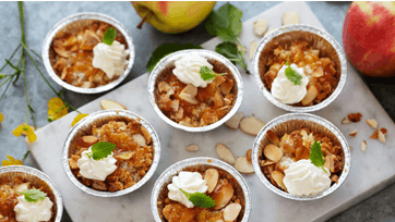 Riv marcipanen groft, tilsæt smørret lidt ad gangen og rør til en jævn masse. Rør hurtigt sukker og hvedemel i og saml til en smuldredej. Drys halvdelen af dejen i formene. Skræl æblerne, fjern kernehuset og skær æblerne i tern. Fordel æblerne i formene og drys resten af dejen over. Drys med perlesukker og mandler. Bag kagerne ved 200º i ca. 12 min. Servér kagerne varme med flødeskum eller vaniljeis til.