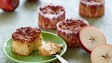 Pisk æg og sukker luftigt. Tilsæt mel blandet med bagepulver og vaniljesukker. Lun mælk og smør og vend det i dejen. Riv æblerne på den grove side af rivejernet og vend dem i dejen. Hæld dejen i små kokotter eller muffinsforme og bag dem midt i ovnen ved 200° i 20 min. Kom smør, kokosmel, farin og mælk i en gryde og bring det i kog under omrøring. Fordel glasuren på de forbagte kager og bag dem færdig ved 225° i 10 min.