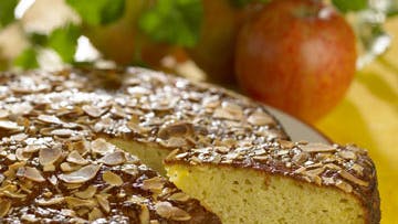 Pisk æg, sukker og vaniljesukker luftigt. Tilsæt smør og mel blandet med bagepulver og kardemomme. Riv marcipan og æbler groft og bland det i dejen. Tilsæt citronskal og -saft. Hæld dejen i en smurt springform. Drys mandlerne over. Bag kagen nederst i ovnen ved 175° ca. 30 min.