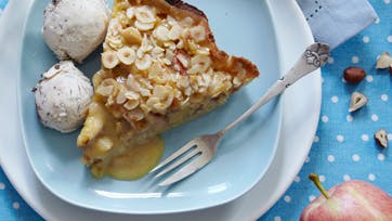 med den. Forbag bunden ved 200º i 10 min. Skyl æblerne, fjern kernehusene, skær dem i tynde både og vend dem i kanel. Læg dem på den forbagte bund. Riv marcipanen og rør alle ingredienserne til mazarinen sammen evt. på maskine. Læg den over æblerne og bag kagen ved 175º i 30-35 min. Imens tilberedes karamellen. Smelt fløde, sukker, smør og honning i en gryde, til massen er let gylden. Det tager ca. 10-12