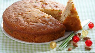 Rør smør og sukker blødt og rør æggene i et ad gangen. Rør mel og bagepulver i skiftevis med ananasmosen. Hak mandler og cocktailbær, riv citronskallen fint og vend det i dejen. Kom dejen i en smurt, 23 cm springform og bag den ved 170° i 60 min. Lad kagen køle og pak den i folie, til den skal serveres. Kagen bliver kun bedre af at stå et par dage.