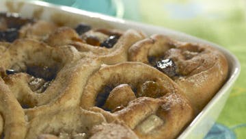 Opløs gæren i den lune mælk. Kom vand, æg, olie, salt, sukker og speltmel i dejen og hæld så hvedemelet i, mens du ælter til en glat dej (ca. 10 min.). Lad den hæve i 1 time tildækket. Slå ned og rul ud til et rektangel på 25 x 30 cm. Pensl med smeltet smør. Kom tynde skiver banan i en skål med hakkede abrikoser, sukker, kanel og appelsinskal. Hæld det over dejen og rul til en roulade. Skær i 9 tykke skiver og sæt dem i en smurt kvadratisk (20 x 20 ) form. Lad dem efterhæve 30 min. og bag ved 200° i 20 min. Under bagningen pensles hvert 5. min. med honningen. Serveres lun.