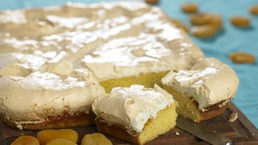 Rør smør og sukker blødt og luftigt. Rør æggeblommerne i en ad gangen. Fold mel og bagepulver i skiftevis med mælk. Hæld i foret bradepande (ca. 30 x 40 cm) og bag i 15 min. ved 170°. Smør forsigtigt marmeladen over. Pisk hviderne halvstive og pisk så sejt med sukkeret tilsat ad 4-5 omgange. Smør på som top og bag færdig ved samme temperatur i 15-20 min. mere.