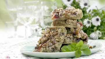 Bland mel, havregryn, bagepulver og sukker og hak smørret heri. Saml dejen med fløden og rul den ud mellem to stykker bagepapir i 2 mm tykkelse. Læg dejen i en 20 x 30 cm bradepande, så den går ca. 1 cm op ad siderne, og bag den ved 200° i 15 min. Udsten blommerne, skær dem i kvarte og riv marcipanen. Bland sukker, sirup, smør, piskefløde og mel, varm blandingen op til lige under kogepunktet og vend nødderne i. Fordel marcipan og blommer på bunden og hæld karamellen over. Bag kagen i yderligere 15 min. ved 200° og lad den køle før servering.