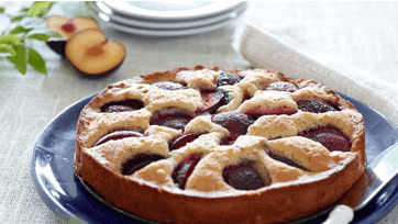 Rør smør og sukker luftigt. Del æggene i blommer og hvider. Rør æggeblommerne i smørret et ad gangen. Bland mel og bagepulver og rør det i dejen skiftevis med fløde og vaniljesukker. Pisk hviderne stive og vend dem forsigtigt i dejen til sidst. Kom dejen i en velsmurt springform eller tærteform med løs bund. Halvér blommerne, tag stenene ud og skær blommerne i kvarte. Læg blommerne tæt oven på dejen. Bag kagen på midterste ovnrille 35-40 min. ved 180°. Køl kagen af på en rist og fjern forsigtigt formens ring. Server kagen lun med et drys flormelis og med flødeskum til.