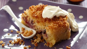 Skyl blommerne og skær dem i tern. Smelt smørret og pisk æg og sukker luftigt. Rør smørret i æggesnapsen, bland bagepulver og mel og vend det i. Hæld dejen i en smurt sandkageform og fordel blommerne over. Hak smør, sukker, kokos og mel sammen til en smuldredej og fordel den over blommerne. Bag kagen ved 180° i 40 min. og servér den lun med kold cremefraiche eller vaniljeis.