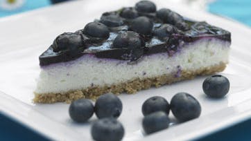 Smelt smørret og smuldr kiksene i. Pres blandingen sammen som bund i en 24 cm springform. Udblød og smelt husblassen og lad den afkøle let. Rør flødeosten med æggeblommer, cremefraiche og citronskal. Rør den let afkølede husblas i osteblandingen. Pisk hviderne stive med flormelis og vend dem i osteblandingen. Fordel blandingen over kiksebunden og stil kagen koldt i et par timer. Udblød husblassen og fordel halvdelen af blåbærrene over kagen. Rør resten af bærrene med sukker og vand over svag varme, til sukkeret er opløst. Tilsæt og smelt husblassen og lad det afkøle let. Hæld blåbærgeleen over kagen og stil den koldt, til geleen har sat sig.