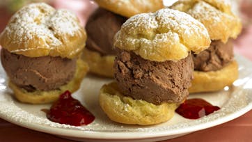 Bland sukker og Melatin sammen med kakao og glukose og vand i en gryde og varm op til kogepunktet under omrøring. Køles af til badevandstemperatur. Hak chokoladen groft og rør den ud i massen. Køles helt af og fryses under omrøring. Kugles op og lægges i de halverede eclairs, der drysses med sigtet flormelis og serveres med kold, blendet hindbærsovs.