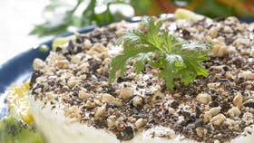 Pisk ost, æggeblommer og sukker lyst og cremet. Pisk fløden stiv og vend den i. Pisk hviderne stive og vend dem forsigtigt i. Hæld blandingen i en springform og drys overfladen med chokolade og nødder. Sæt isen i fryser mindst 2 timer. Tag isen ud ca. 20 min. inden serveringen.