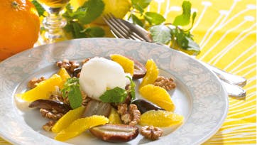 Kog vand og sukker sammen i 5 min. til sukkeret er opløst. Kom citronsaften i og afkøl lagen. Kør lagen på ismaskine eller sæt den i fryseren og rør af og til - evt. med tilsætning af 1 pasteuriseret æggehvide. Kom den i fryseren og lad den sætte sig. Skræl appelsinerne med en kniv helt til kødet og skær dem i fileter. Halver dadler og fjern stenen. Bland dadler, appelsinfileter og nødder og læg på tallerkner og kom skefulde af citronsorbet på.