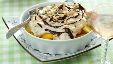 Skræl mangoen og skær den i skiver. Sautér skiverne på en pande med siruppen og fordel dem i to ovnfaste portionsskåle. Knus makronerne og rist nødderne let, tag lidt fra til pynt. Pisk æggehviden stiv og vend makroner og nødder i. Fordel æggehviden over mangoskiverne og bag desserterne ved 175° i 15 min. Rør appelsinsaften i den smeltede chokolade. Hæld chokoladen over desserterne og server med resten af de ristede nøddekerner.